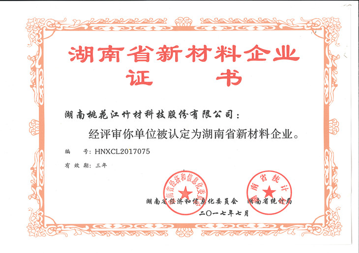 2017年7月,湖南省經(jīng)濟(jì)和信息化委員會(huì)、湖南省統(tǒng)計(jì)局為湖南桃花江竹材科技股份有限公司正式頒發(fā)“湖南省新材料企業(yè)”證書(證書編號(hào):HNXCL2017075)。湖南省新材料企業(yè)的認(rèn)定,標(biāo)志著湖南桃花江竹材科技在新型竹材領(lǐng)域的成績(jī)得到國(guó)家認(rèn)可與支持,是一項(xiàng)極具含金量的突破性榮譽(yù)。作為中國(guó)竹業(yè)龍頭企業(yè),湖南桃花江竹材科技一直走在新型竹材研發(fā)、運(yùn)用和推廣的前沿,為全球竹產(chǎn)業(yè)的發(fā)展持續(xù)貢獻(xiàn)力量。